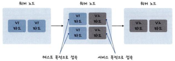새 버전 pod만 서비스 목적으로 접속 가능하고 이전 버전 Pod는 테스트 목적으로만 접속 가능하다.